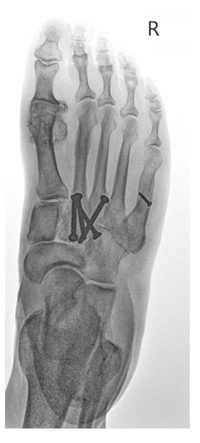Die 72-jährige Patientin hatte erstmalig nach einem längeren Spaziergang Schmerzen sowie eine Schwellung im Bereich des rechten Mittelfusses verspürt. Röntgenologisch wurde ein Ermüdungsbruch des zweiten Mittelfussknochens festgestellt, welcher in Folge einer Überbelastung auftreten kann .