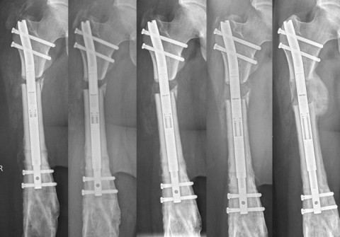 Bei einem schweren Verkehrsunfall zog sich eine 22-jährige junge Frau ein gravierendes Polytrauma zu. Durch die unverschuldete Kollision ihres Motorrades mit einem Personenwagen wurde ihr Oberschenkel auf der rechten Seite zertrümmert. Gleichzeitig kam es zu einem ausgeprägten Weichteildefekt an der Innenseite des Oberschenkels. Der Knochen wurde aufgrund der offen liegenden Knochenanteile mit einem äusseren Fixateur stabilisiert. Nach Deckung des ausgeprägten Weichteildefektes konnte ein Marknagel eingebracht werden. Leider kam es in der Folge nicht zu einer Ausheilung, sondern zu einer Auslockerung des Marknagels und einer Pseudoarthrose, welche wiederum mit einer Varusfehlstellung kombiniert war (Bild 1).