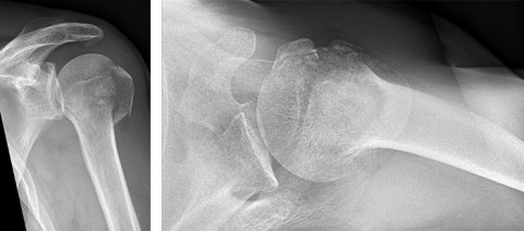 Nach 6 Monaten sahen wir den Patienten erneut zur Kontrolle. Das Röntgenbild zeigte einen verheilten Bruch. Die klinische Testung ergab einen nahezu wiederhergestellten seitengleichen Bewegungsumfang. Im Alltag bestanden fast keine Einschränkungen mehr, bis auf gewisse diskrete Beschwerden bei Belastungen. Die Physiotherapie wurde auf Grund der diskreten Resteinschränkung weiterverschrieben.